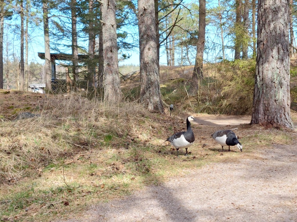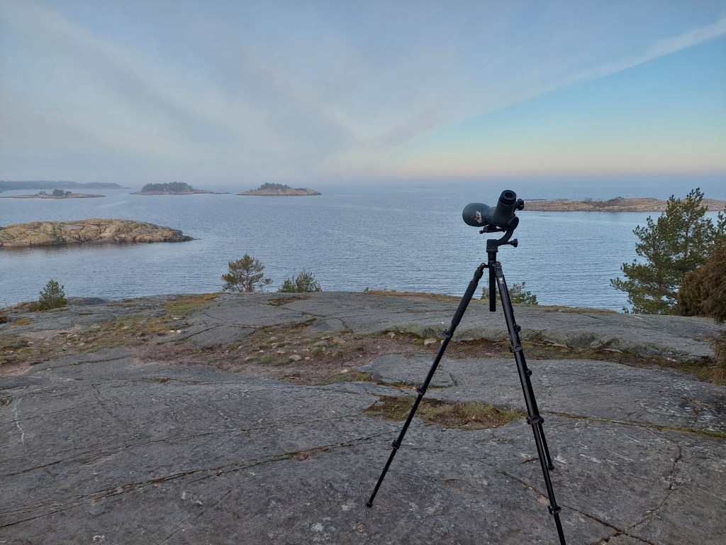 Porkkalan kärkeen Pamskataniin tuli ehdittyä kuudeksi ja staijia (=muuton seurantaa) harrastin neljän tunnin ajan. Päivästä oli tulossa aurinkoinen ja tuuli oli lounaasta, eli linnuille erinomainen muutto sää. Tällaisen sään ongelma on kuitenkin se, että linnut muuttavat hyvin korkealla silmän ulottumattomissa. Eli vaikka lintuja muuttaisi isoja määriä, ei niistä maankamaralta näe kuin pienen osan. Auringosta ja lounaistuulesta huolimatta tai sen vuoksi sää kuitenkin oli yllättävän viileä, ensimmäisen tunnin aikana ei vielä kylmä tullut, mutta toisen tunnin kohdalla tuli yllättävän vilu. Onneksi aurinko rupesi lämmittämään myös Pamskatanin kärkeä. Mutta tällaista kevät on meren äärellä. Meri on kylmä ja jos vähänkin tuulee mereltä päin, ovat olosuhteet varsin jäätävät, vaikka olisikin vaatetta päällä.